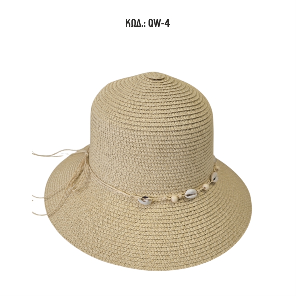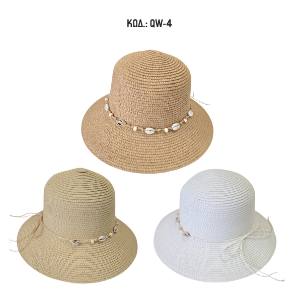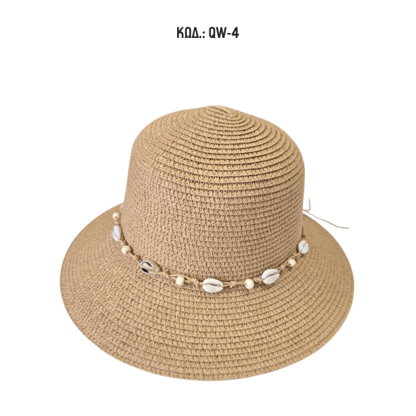 Γυναικείο καπέλο με μικρό γείσο ψάθινο με διακοσμητική κορδέλα με χάντρες και κοχύλια.