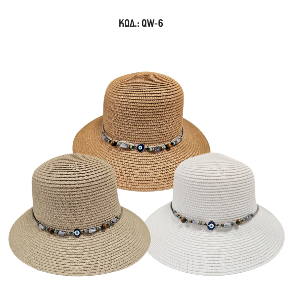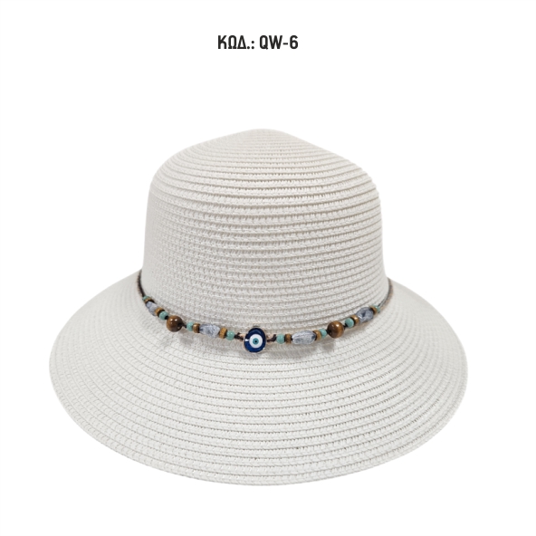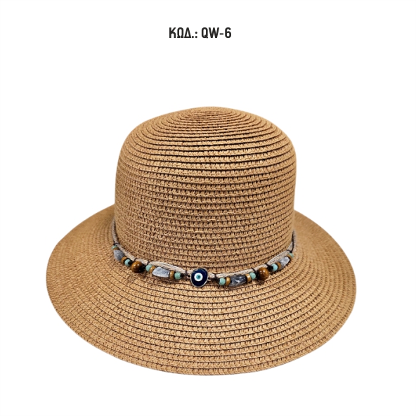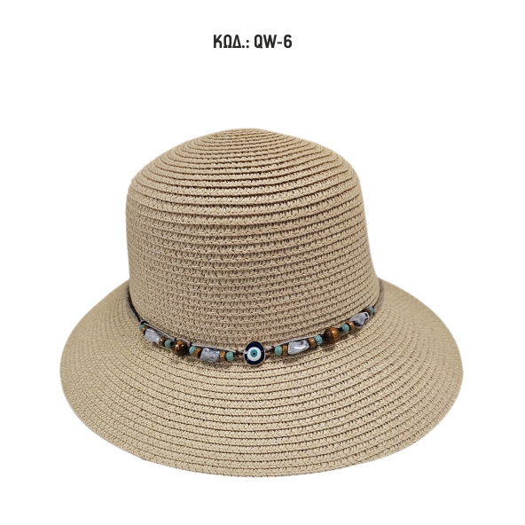 Γυναικείο καπέλο με μικρό γείσο ψάθινο με διακοσμητική κορδέλα με χάντρες και μάτι.