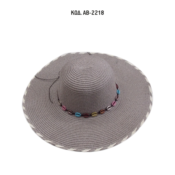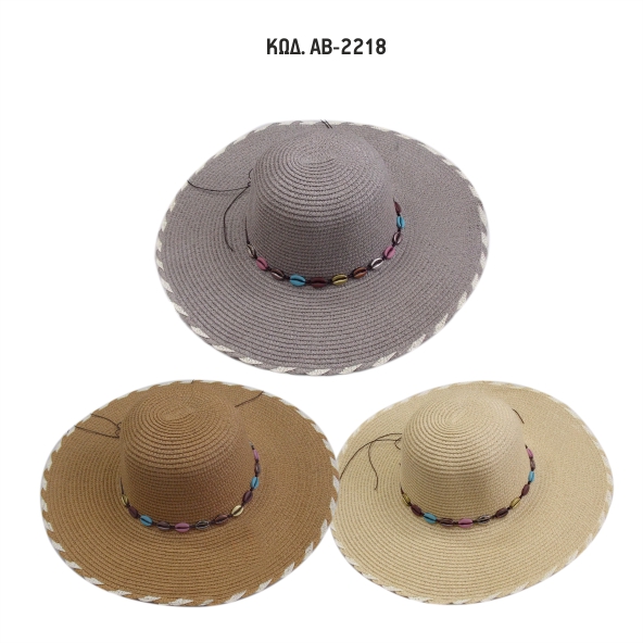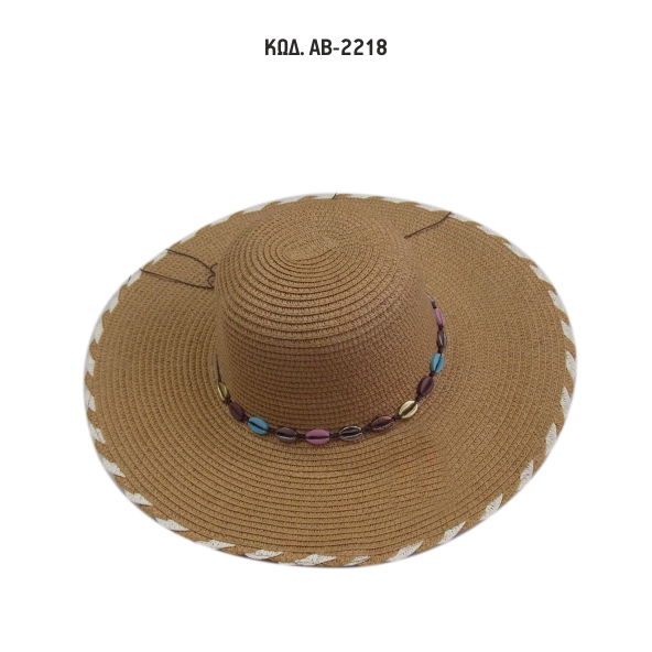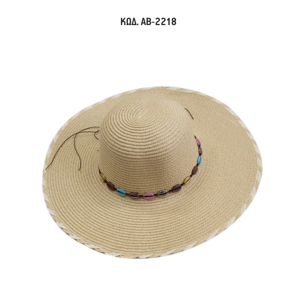 Γυναικείο καπέλο με πλατύ γείσο ψάθινο με διακοσμητική κορδέλα με κοχύλια.