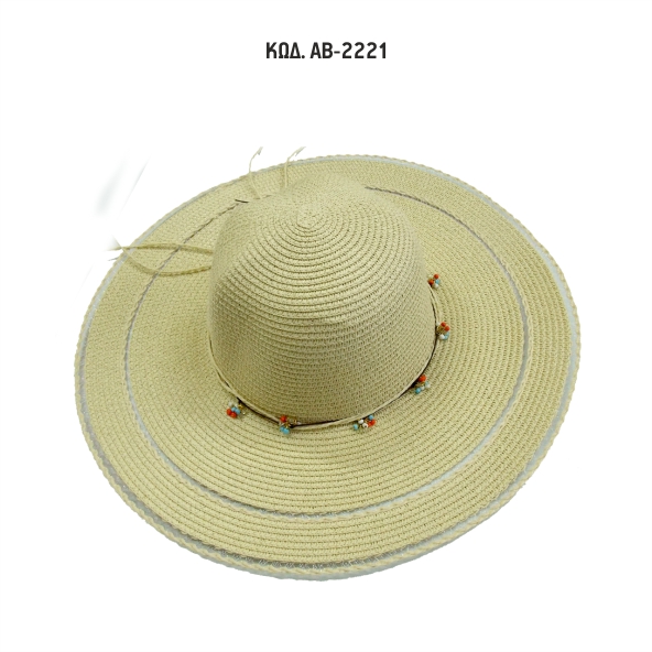 Γυναικείο καπέλο με πλατύ γείσο ψάθινο με διακοσμητική κορδέλα ψάθινη με χάντρες.